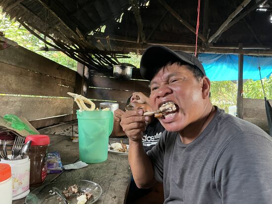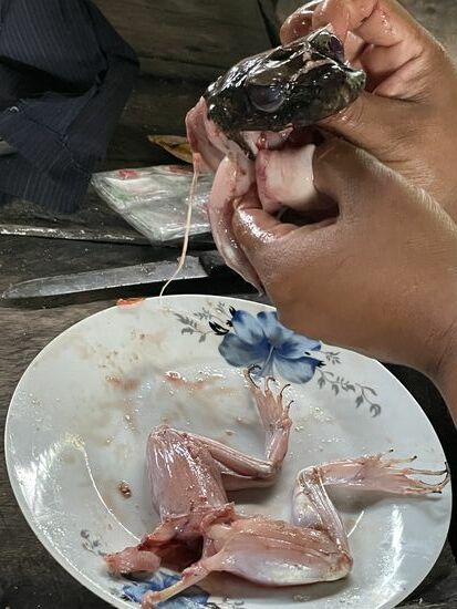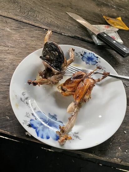 Später hat Rosa noch eine besondere Überraschung für mich. Eine ihrer Tanten, bei denen sie am Nachmittag zu Besuch war, hat ihr einen Frosch geschenkt. Sie hat ihm bereits die Haut abgezogen und fritiert ihn in der Pfanne. Natürlich geht sie davon aus, dass ich keinen Frosch esse, aber sie liebt es, mich damit aufzuziehen. Mit Hochgenuss verspeist sie ihren Leckerbissen, gibt aber gern ein Bein an Liborio ab, der dadurch zu seinem ersten Frosch kommt. Es schmecke wunderbar, bestätigt er mir.