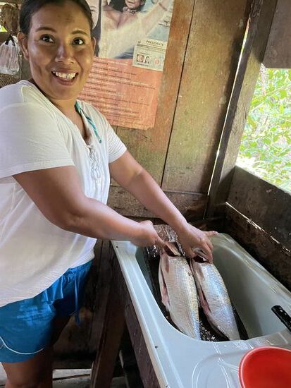 Dann mache ich mich auf die Suche nach Liborio und finde ihn zusammen mit Rosa im Haus ihrer Tanten. Rosa ist gerade dabei, die beiden Fische von gestern Abend auszunehmen. Einen haben Abuelito und Abuelo bekommen, den anderen bekam die junge Frau mit dem Bebe, die mit uns mitgefahren war. Sie sind bereits wieder unterwegs. Zurück nach Brilla Nuevo, solange der Fluss noch genug Wasser führt. Es ist anzunehmen, dass der Fluss in den nächsten Tagen mit dem Boot nicht mehr durchgehend befahrbar ist.
