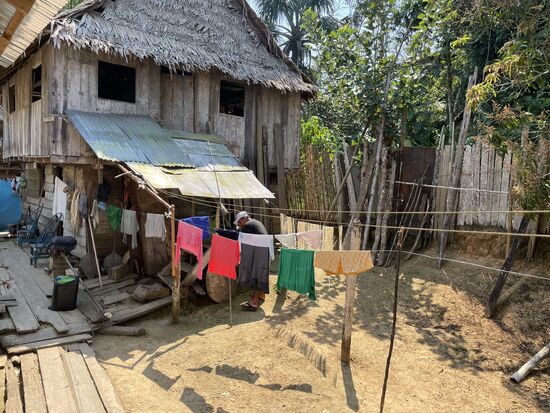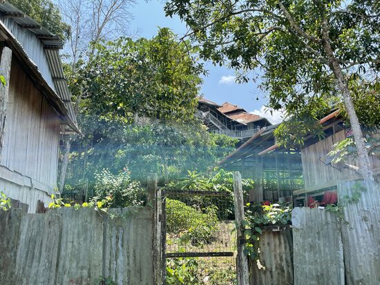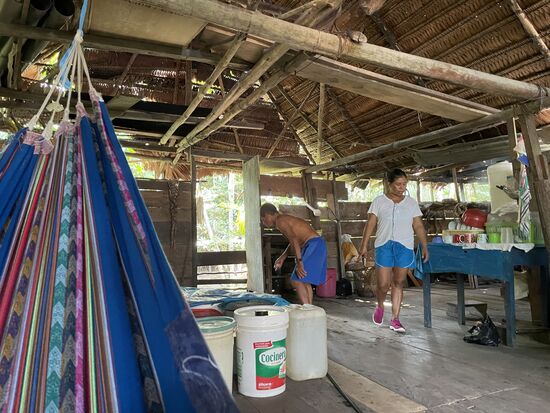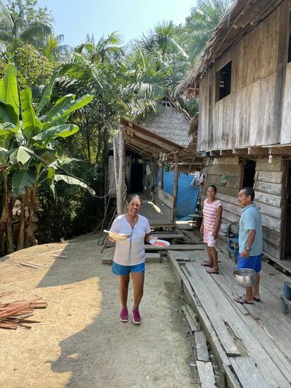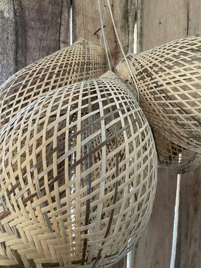 Und natürlich kommt immer mal eine Freundin vorbei, mit der Palmblätter aufgespalten oder versponnen werden. Handarbeiten, die später auf dem Markt in Iquitos verkauft werden, werden in allen Häusern hergestellt. Sie sind eine willkommene Einkommensquelle, die während der Pandemie weitgehend versiegt war. An der Wand entdecke ich eine schöne Flechtarbeit. Auch das ist eine selbst hergestellte Arbeit, die als Schmuck dient. Man könnte zum Beispiel eine Lampe daraus machen. Gibt bestimmt einen wunderschönen Schein.