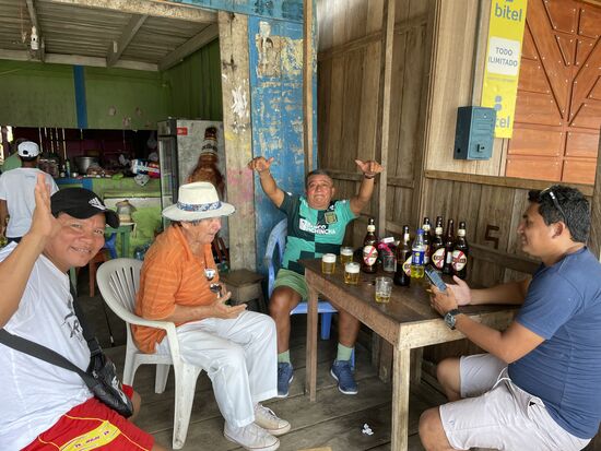 Bevor wir zu den Booten gehen, von wo wir zum Strand fahren können, treffen wir in der Hafenkneipe auf Grippa, der mit zwei Freunden den Sonntag mit ein paar Bieren begiesst. Er lädt uns zu einem Glas ein. Die beiden Freunde sind Ärzte, arbeiten im lokalen Spital. .Wie das hier mit der Impfung laufe, will ich vom jüngeren wissen. Soweit ganz gut, meint dieser, die ältere Generation sei inzwischen wohl durchgehend geimpft. Auch in den Dörfern klappe das ganz gut, denn dort würden Volontäre hingeschickt. Allerings gibt es auch hier einige Skeptiker. Vor allem weil verschiedene Gerüchte im Umlauf sind. So glauben viele, dass die Impfung die Zeugungsfähigkeit beeinträchtigen könnte. Und ausserdem geht die Lüge um, es würde chinesischer Impfstoff abgegeben. Das sei aber überhaupt nicht wahr, man verwende vor allem Pfizer/Biontech. Das vom chinesischen Impfstoff hatte ich auch in Lima schon gehört, scheint also ein hartnäckiges Gerücht zu sein.