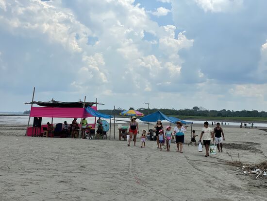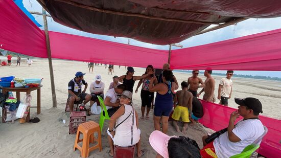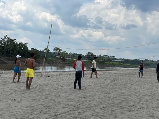 Strand, das isi die Sandbank, die beim Zufluss des Ampiyacu in den Amazonas liegt und die mit dem Sinken des Wassers immer grösser wird. Es sind erst wenige Leute hier und diese hocken unter dem Plastikdach, das ein paar Jugendliche aufgetellt haben und wo aus grossen Boxen Partymusik ertönt. Auch wir ergattern uns einen der wenigen Plastikstühle und bestellen etwas zu trinken. Eine Frau bietet Ceviche an, die peruanische Spezialität aus rohem Fisch der in viel Zitronensaft gegart ist mit Yucca und Süsskartoffen und viel Zwiebeln. Ein paar Stangen sind aufgetellt, denn hier soll am Nachmittag ein Volleyball-Turnier stattfinden. Sobald Rosa das hört, hält sie nichts mehr auf dem Stuhl. Sofort versucht sie eine Mannschaft zusammenzubringen und schon bald springt sie trotz der Hitze dem Ball hinterher.