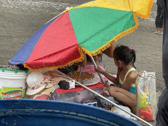 Es ist sehr heis und ich mag meinen Schattenplatz nicht aufgeben. Auch das Wasser, in dem sich vorwiegend Kinder tummeln, kann mich nicht wirklich anziehen, denn es scheint ein richtiges Schlammbad zu sein. So bleiben wir also unter dem behelfsmässigen Sonnenschutz sitzen, während immer mehr Leute kommen, neue Plastikplanen aufstellen und neue Verkaufsstände aufbauen.