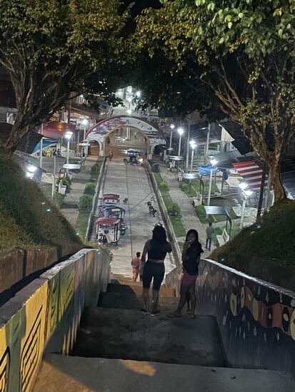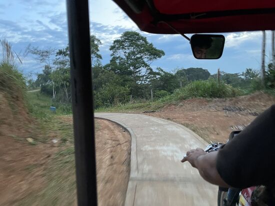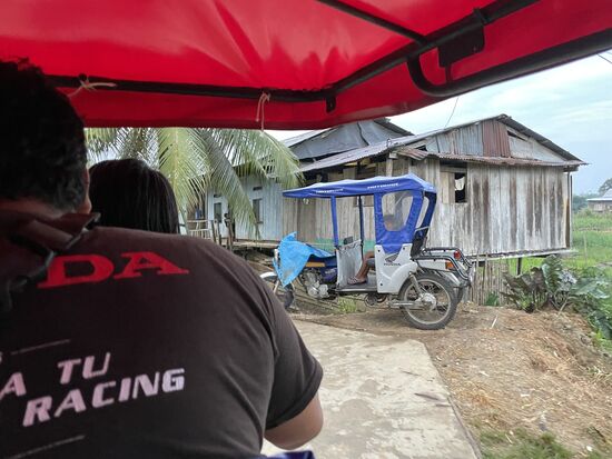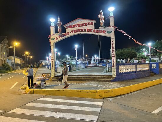 Später, als ich wieder auf die Strasse trete, wartet Liborio auf der Bank vor dem Hotel. Er schlägt eine Rundfahrt durch Pebas vor. Und tatsächlich finden wir einen Mototaxi-Fahrer der versteht, was wir meinen und der uns in der Stunde vor dem Eindunkeln durch den Ort fährt. Er zeigt uns das Krankenhaus und mindestens fünf Schulhäuser. Alle immer mit Mauern umschlossen. Pebas hat gut 4000 Einwohner. Es gibt viele Holzhäuser aber vor allem im Stadtzentrum viele gemauerte Häuser. Es gibt auch ein paar Hospedajes, doch die vermieten vorwiegend an Dauermieter, die drei Hotels unten am Hafen scheinen die einzigen Touristenunterkünfte zu sein.