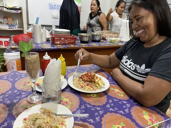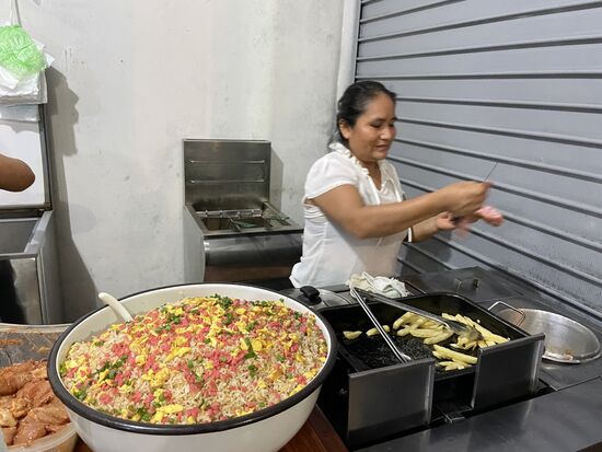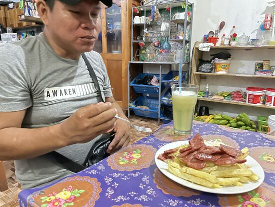 In der Nähe des Hauptplatzes steigen wir bei einem Imbiss aus. Dieser schien mir bei unserem Besuch am ersten Abend schon sehr ansprechend zu sein. Heute bestelle ich eine Portion Chaufa, gebratener Reis. Leider ist er nicht heiss, obwohl die Wirtin mir zugesichert hat, er wäre ganz frisch zubereitet. Ich habe aber längst gemerkt, dass man hier gern lauwarm isst. Einzig die Pommes kommen ganz heiss aus dem Oel. Und auch die Wurst, die Liborio bestellt hat, wurde längs in Streifen geschnitten und im heissen Oel kurz frittiert. Rosa lässt sich ein Stück Chicken auf den Reis legen.