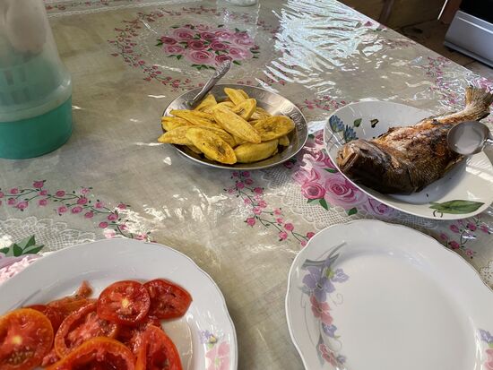 Der Tag verspricht wieder, heiss zu werden. An solchen Sonntagen, würde man hinaus an den Strand gehen, hat Liborio gestern schon verkündet. Darum habe ich auch bereits das Badekleid unter dem TShirt angezogen. Doch bevor wir gehen, gibt es noch ein Frühstück. Oder ist das ein vorgezogenes Mittagessen? Jedenfalls hat Rosa inzwischen den Fisch für mich gebraten. Da hilft kein Protestieren, "Du musst etwas essen", ist die einhellige Meinung der beiden. Und er schmeckt tatsächlich wunderbar. Ist einfach etwas gross genug für mich allein, aber Liborio hilft mir, als ich nicht alles essen kann. Rosa hat extra noch einen Tomatensalat mit feinen reifen Tomaten, viel Zitronensaft und etwas Salz gemacht. Und das, obwohl sie doch selber kaum etwas roh essen. Auch keine Früchte, die meisten verarbeiten sie zu Erfrischungsgetränken.