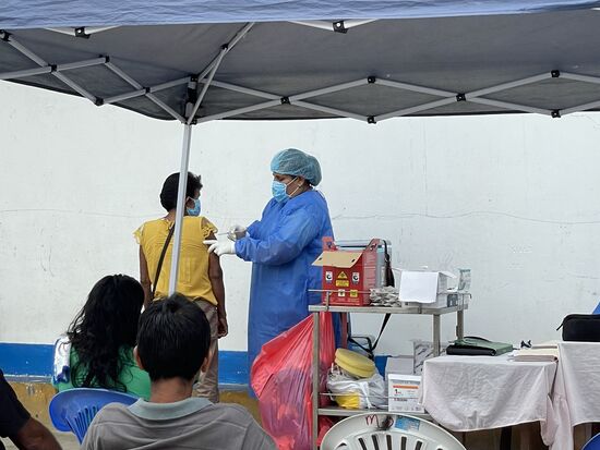 Hier wird heute wieder geimpft. Unter zwei blauen Zelten warten die Leute bis sie aufgerufen werden. Eine Krankenschwester gibt dann die Impfung ab. Es geht ganz ruhig ab und es hat immer Leute in allen Altersstufen, wenn ich hierher komme.