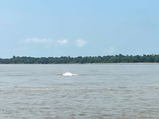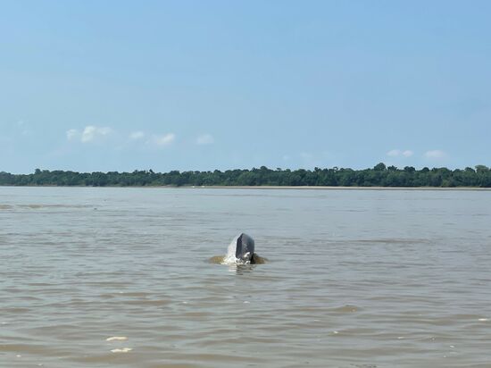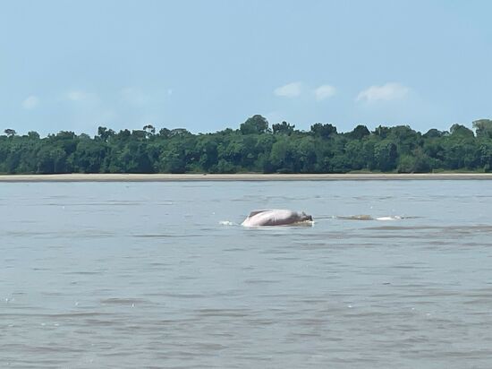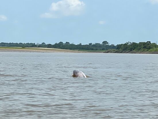 Zuerst ist das Wasser ruhig, doch dann taucht plötzlich einer auf. Ganz nahe beim Boot, und dort noch einer, ein dritter. Tatsächlich tummeln sich hier beim Zufluss des Ampiyacu in den Amazonas viele Delfine. Immer dort wo zwei Flüsse sich treffen, ist das Wasser tiefer, gibt es mehr Fische und damit mehr Futter. Natürlich bin ich mit meinem Handy auf Empfang, versuche die Wasseroberfläche auf verdächtige Luftblasen abzusuchen, aber die Delfine halten sich nicht an die Regeln, tauchen immer dort auf, wo ich gerade nicht mit der Kamera hinziele und sind längst wieder verschwunden, wenn ich soweit bin, abzudrücken. Aber sie sind überall, in der Nähe, weit weg und manchmal tauchen sie sogar unter dem Boot durch. Ein paar Aufnahmen gelingen mir dann aber doch noch, doch es sind eben nur ganz vereinzelte, weit weg.