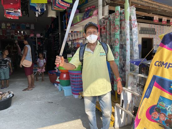 Auf der Strasse vor dem Hotel treffe ich auf Tio Victor. Ihn hatten wir am ersten Tag im Bora-Dorf in der Nähe besucht. Ob ich ihm ein wenig helfen könnte, er würde etwas Unterstützung brauchen, meint er. Was er sich den vorstelle, will ich wissen, worauf er meint, dass er dringend eine neue Machete brauche. Er ist überglücklich, dass ich ihm im nächsten Laden eine Machete für 25 Soles kaufe. Jetzt braucht er noch 10 Soles um sie schärfen zu lassen.