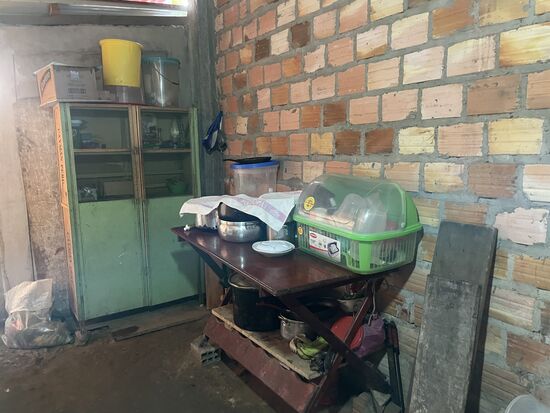 Nebst dem Eingangsbereich, der später zu einem Laden umfunktioniert werden soll und dem Kinderzimmer gibt es noch einen anderen Raum, den ich als Küche definieren würde. Jedenfalls lagern hier Lebensmittel und das Geschirr. Ob hier am Abend auch eine Matratze auf den Boden gelegt wird? Die Feuerstelle zum Kochen ist hinten im kleinen Hof, in dem man vielleicht später noch das eine oder andere Zimmer anbauen könnte. Und ganz hinten im Garten ist die Toilette, die ich mir allerdings nicht von nahem ansehen möchte.