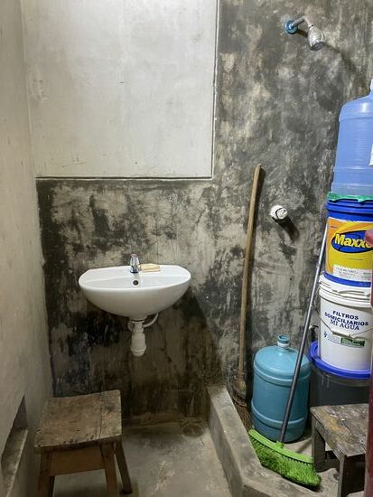 Im kleinen Badezimmer, das mit WC, Lavabo und Dusche eigentlich ganz gut aussieht, gibt es kein Wasser, es ist also völlig unbrauchbar. Einzig die Kanister mti dem Wasser, das von einer Pumpe geholt werden muss, werden in der Dusche gestapelt.