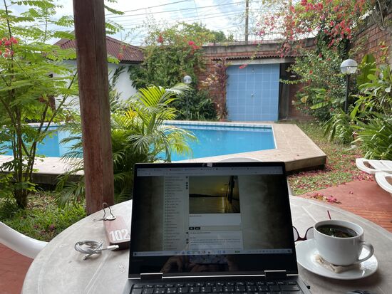 Das reicht gerade, um meinen Schreibplatz am Pool einzurichten. Mit einem Kaffee, denn das Frühstück habe ich um 10 Minuten verpasst. Von 7 - 9 stand da im Zimmer aufgeschrieben, aber ich habs zu spät gesehen. Jetzt gibt es eben nur einen Kaffee, den mir der Concierge machen konnte.