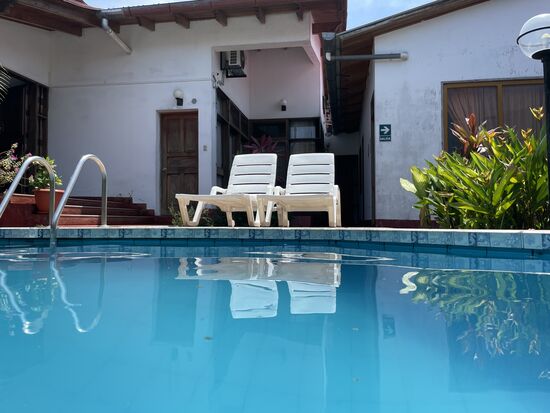 Tatsächlich, um halb zwölf klappe ich meinen Laptop zu, schnappe mir meine Badehose und gehe in den Pool. Abkühlung bringt er nicht, denn das Wasser ist badewannenwarm. Ich kenne nur einen Pool in Dschungel, der tatsächlich kühl ist. Das ist der von Walter im Casa Fitzcarraldo. Dank einem ausgeklügelten Röhrensystem, das unter dem Gelände durchführt und das Wasser dadurch immer wieder abkühlt, bleibt der Pool angenehm kühl.