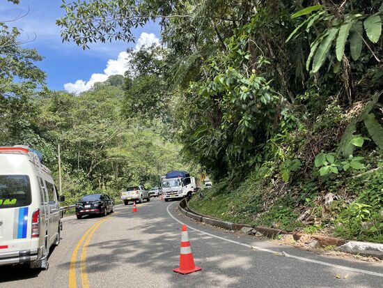 Nach einer halben Stunde, mir ist tatsächlich fast schlecht, hält er am Strassenrand bei einem Verkaufsstand an, kauft einen Plastiksack mit Chicha (Getränk aus Mais) und ich wechsle auf den Vordersitz. Hier kann ich mich anschnallen, da ist alles viel bequemer. Und ausserdem kommen wir bald zu einer Baustelle, wo wir auf den Gegenverkehr warten müssen. Es geht über einen kleinen Pass, und immer wieder begegnen wir schweren Lastwagen. Die Strecke ist sehr stark befahren, denn es ist die kürzeste Verbindung von der Hauptstadt Lima zum Amazonas und dadurch zur Versorgung von Iquitos und weiter nach Brasilien.