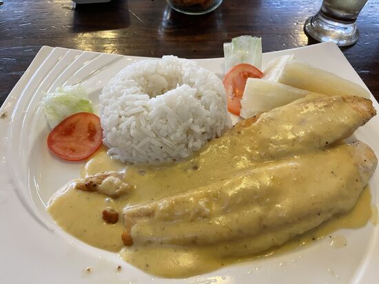 Später mache ich mich auf, die Stadt zu erkunden, oder vielleicht sollte ich sagen, etwas in den Magen zu bekommen. Ganz in der Nähe finde ich ein grosses schönes Restaurant, das zwar um diese Zeit noch völlig leer ist und wo nur sehr gedämpft Musik aus den Lautsprechern ertönt. Also genau das richtige für mich. Der Fisch an Knoblauchsosse (stört niemanden) mit Reis schmeckt sehr fein.