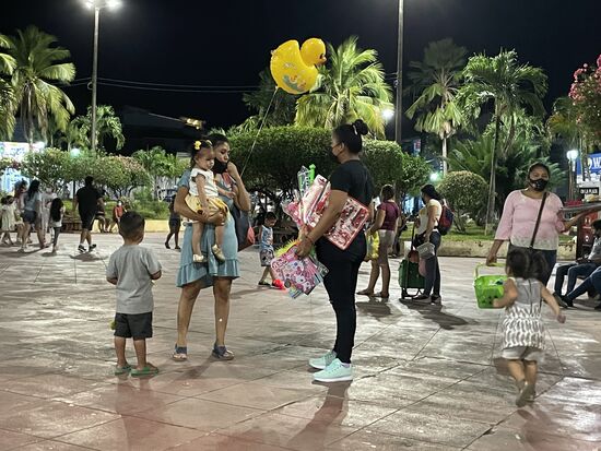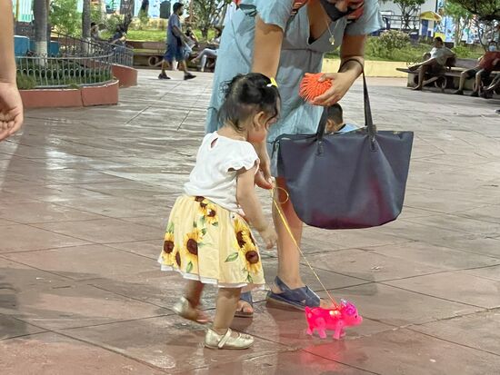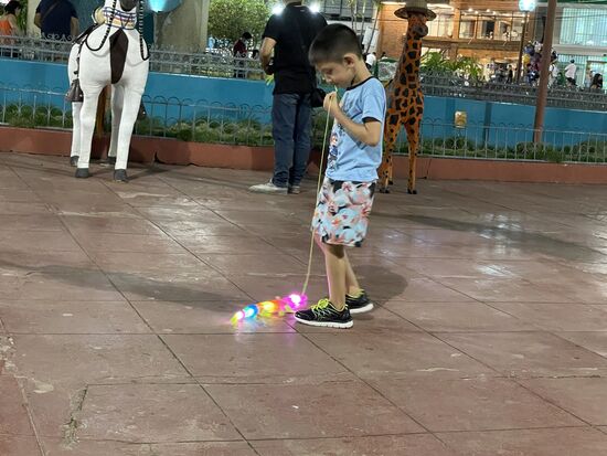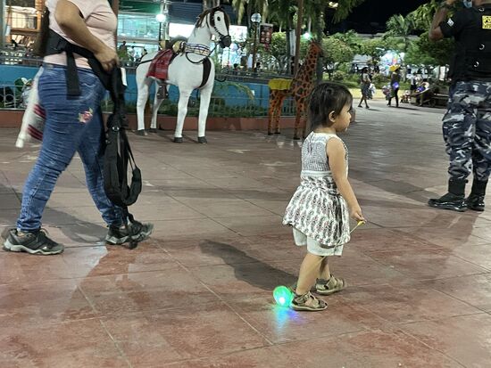 Es ist schon dunkel, als ich aus dem Restaurant komme. Ich setze mich noch eine Weile auf eine Bank auf dem Hauptplatz, sehe den Verkäuferinnen zu, die ihre farbigen Spielzeugsachen versuchen zu verkaufen und den Müttern, die mit ihren Kindern um den Park spazieren. Jedes der Kinder zieht eines der blinkenden Dinger hinter sich her. Der Verkauf scheint also zu funktionieren.
