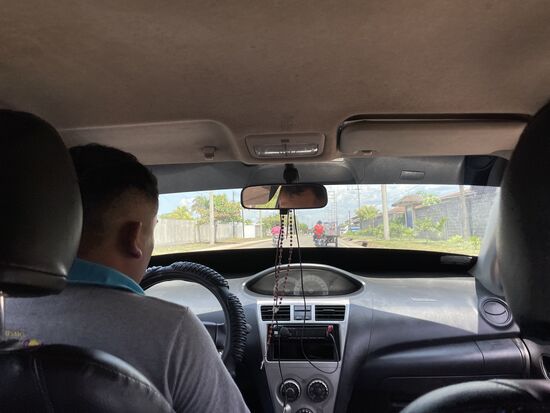 Ich frage nach einem privaten Taxi, muss eine Weile warten bis mein Taxifahrer kommt. Mein Gepäck hat locker im Kofferraum Platz und ich steige hinten ein, hab grad keine Lust auf Konversation.