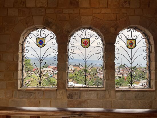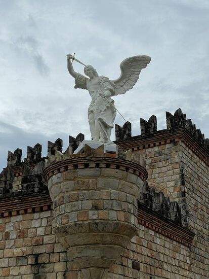 Doch so schön Lamas sich auch präsentiert, seit ein paar Jahren gibt es hier eine Attraktion, die alles andere schlägt. Und die aus einer völlig anderen Tradition kommt. Im Jahr 2004 hat hier nämlich ein Italiener eine mittelalterliche Burg hingebaut. Eine Burg mit Türmen und Zinnen, mit einem eisernen Drachen und einem Erzengel auf dem Turm.