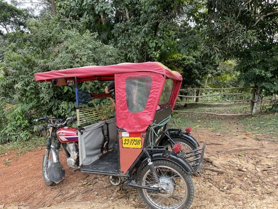 Es ist eine Naturstrasse, die hinauf führt und wir werden ziemlich durchgeschüttelt, während sich das Mototaxi hinauf würgt. Ich staune immer wieder, was man hier den Motoren zumutet. Bein Parkplatz angekommen, werde ich von einem Parkwächter nach meinem Alter gefragt, was mich kurz stutzig macht. Bin ich zu alt, soll ich schummeln? Doch kein Problem, im Gegenteil, ich bin alt genug, um keinen Eintritt zu zahlen. So geht das. Cesas zahlt sowieso nichts, weil er der Chauffeur ist. Bis hierher ist er schon ein paarmal gekommen, doch dann wartet er jeweils bei seinem Moto, bis seine Gäste hinauf gestiegen sind und wieder zurück kommen. Heute steigt auch er tatsächlich zum ersten Mal bis ganz hinauf.