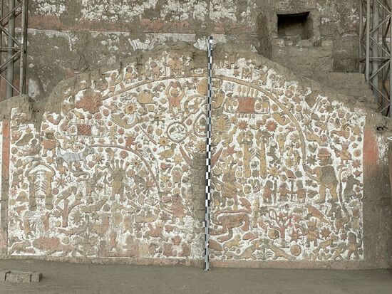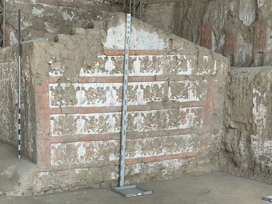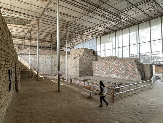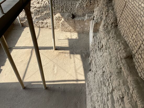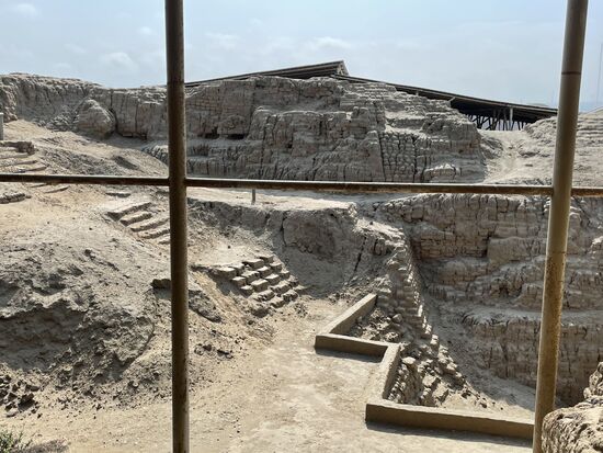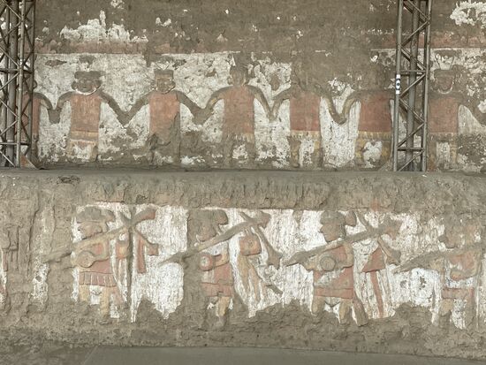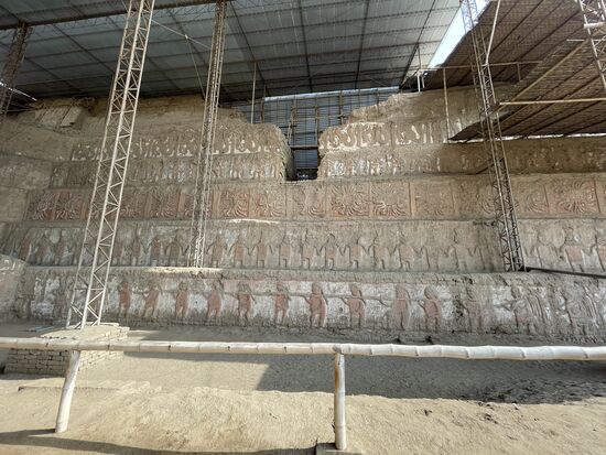 Die Moche errichteten hier im Süden von Trujillo zwei riesige Pyramiden. Die Huaca de la Luna (Mondpyramide) und die Sonnenpyramide. Während die Huaca del sol noch immer ein grosser Steinhaufen ist, wird die Huaca de la Luna seit gut 30 Jahren erforscht. Dabei fand man verschiedene Plattformen, die immer wieder neu überbaut wurden. Es sind riesige Gebäude, die mit Adobesteinen, den von Hand geformten Lehmziegeln, die einzeln geformt und an der Luft getrocknet werden, aufgebaut wurden. Nein, es sei kein Hügel oder Felsen darunter, versicherte mir Lucy während wir langsam eine Rampe hinauf stiegen, alles von Menschenhand gebaut.