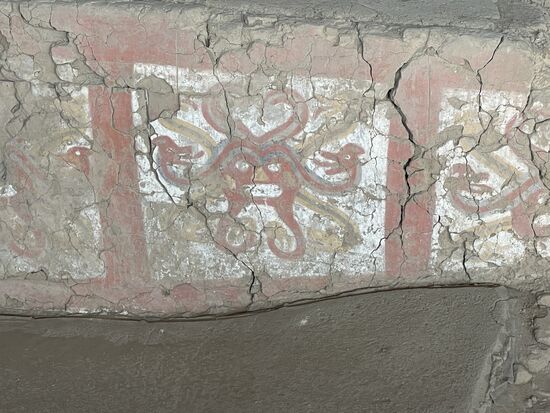 Weiter oben, auf der fünften Plattform zeigen sich noch einmal ganz andere Reliefs. Grosse Romben mit Fratzen, die jede leicht anders aussieht. Rot, schwarz, weiss und gelb sind die Farben der Moche, wobei Rot aus fein gemalenen Steinen, vermischt mit Eiweiss, Schwarz aus Kohle und Weiss von Kalk stammt. Wie Gelb gemacht wurde, weiss ich nicht mehr, wahrscheinlich ebenfalls ein Gestein oder Sand.