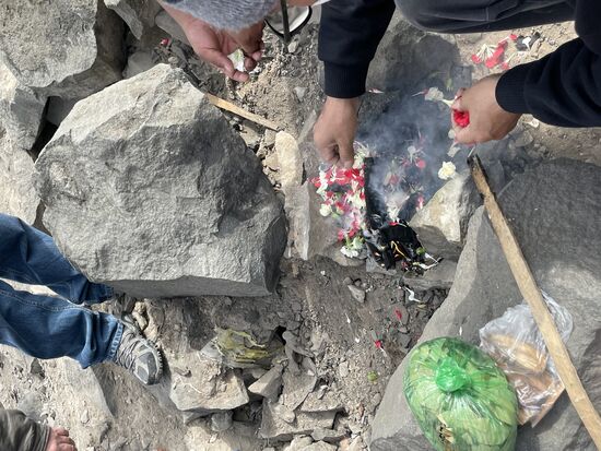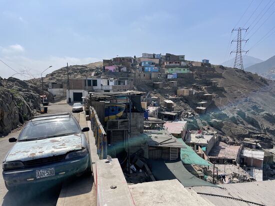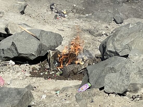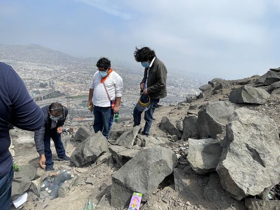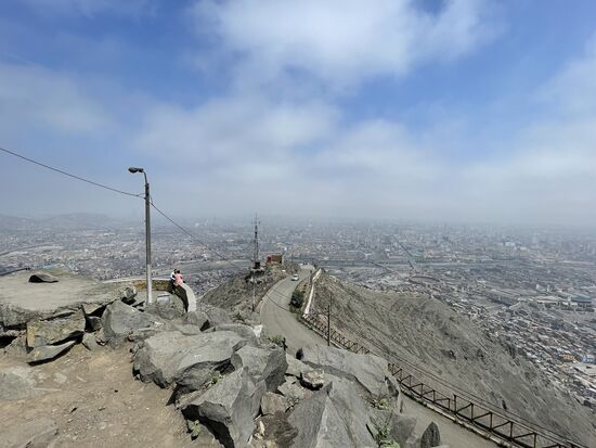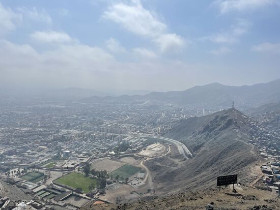 Tatsächlich ist die Sicht viel besser, als letztes Mal, man kann die Hügel erkennen, auf denen die Aussenbezirke von Lima gebaut sind. Überall ziehen sich die Häuser und Hütten die kahlen Berghänge hinauf. Beim Kreuz sehen wir, dass jemand eine Zeremonie macht, ein paar Leute haben in einem Topf ein Feuer gemacht.