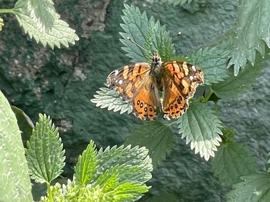 Wir machen einen Rundgang auf der Platzform, und ich finde hinter der Mauer einen kleinen Garten wo ein Schmetterling von Blatt zu Blatt flattert.
