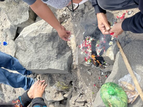 Die Frau hat inzwischen die Feuerstelle mit weissen Nelken geschmückt, etwas Kohle in den kleinen Topf geschüttet und jetzt segnet der Anführer jeden Anwesenden, indem er den Topf über dessen Kopf hält und ein paar Worte in Quechua spricht. Auch mich lädt er ein, hält den Topf über meinen Kopf und vermittelt mir Energie für meine Reisen. Dabei haben wir gar nicht davon gesprohen, dass ich auf einer Reise bin. Er spricht spanisch, aber untereinander sprechen sie Quechua, die Sprache der indigenen Völker Perus.