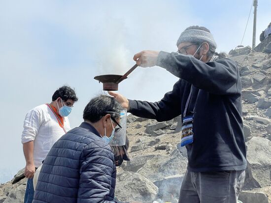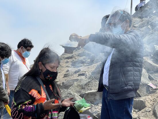 Neugierig wie ich bin, und weil keine Anzeichen von Ablehnung zu erkennen sind, frage ich den Mann, was sie hier machen. "Es ist eine Kontaktaufnahme mit der Pachamama, der Mutter Erde. Sie ist verwundet, sie braucht Hilfe. Wir Indigenen verehren die Pachamama, sie ist unsere wichtigste Gottheit. Darum kommen wir hierher zu diesem Apu, zu diesem Hügel, um sie um Verzeihung zu bitten, um ihr zu helfen, um sie zu heilen."