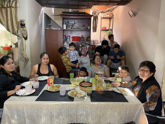 Man ist am Essen und würde mich gern dazu einladen, doch ich winke ab, ich habe sehr spät gefrühstückt. Aber einen Becher Chicha Morena, das Getränkt, dass eine der Schwestern aus dem schwarzen Mais gemacht hat, nehme ich gern an. Die Inca Kola, die Juan rasch organisiert hat, geniessen dafür die Kinder. Ob ich ein Foto machen darf? Aber natürlich sofort versammeln sich alle hinter dem Tisch.