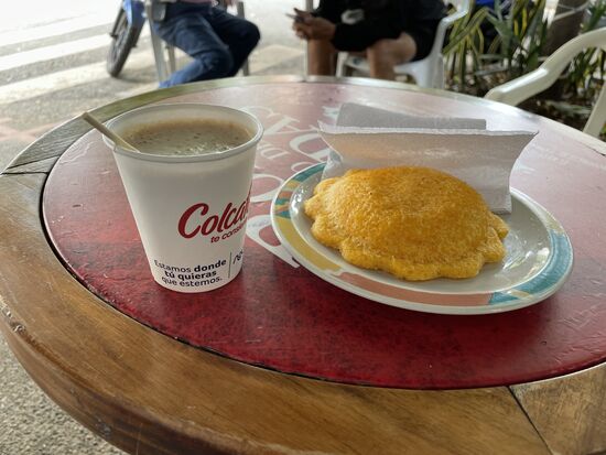 Auf dem Weg geniesse ich an einem Imbiss-Stand ein kleines Frühstück mit einem Cappuccino und einem Gebäck aus Maismehl, gefüllt mit einem Ei. Schmeckt richtig fein.