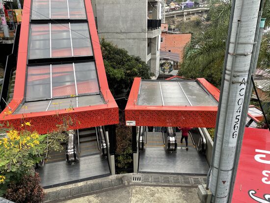 Und dann ist auch die Strasse fertig. Ab hier geht es nur noch über Treppen weiter. Aber es soll doch da irgendwo eine Rolltreppe geben. Ob ich die verpasst habe? Mein GPS zeigt keine Rolltreppe an. Noch einmal lege ich einen Halt ein, warte bis meine Lunge nicht mehr aus dem Körper fahren will und dann sehe ich sie. Die Konstruktion, unter der die Rolltreppe hinauf führt. Sie ist wohl einmalig in der Welt, wurde gebaut, um den Bewohner des armen Quartiers den Zugang zur Stadt zu erleichtern, damit sie schneller hinunter und am Abend auch wieder zurück nach Hause kommen. Vor 10 Jahren wurde sie eingeweiht.