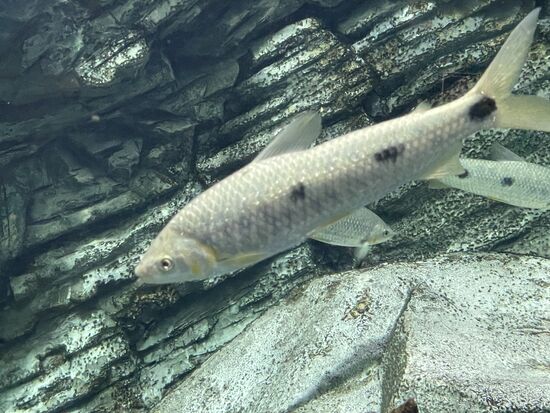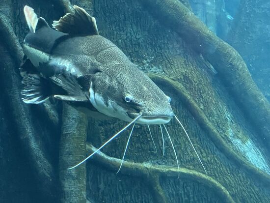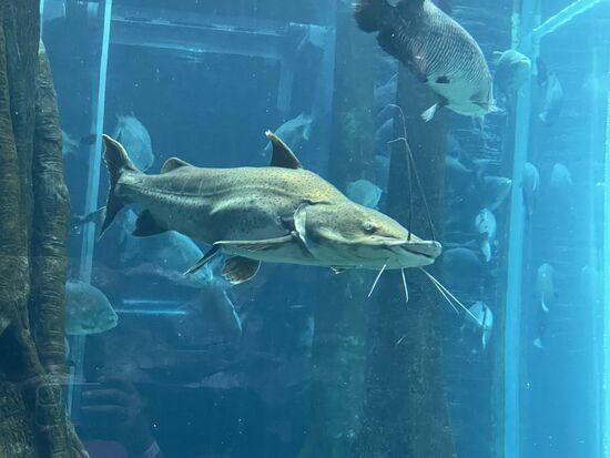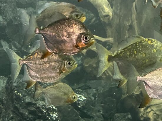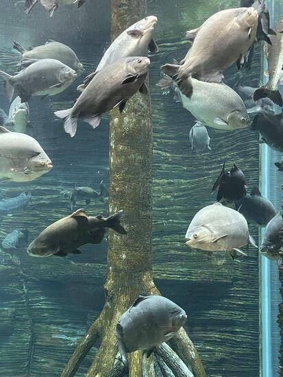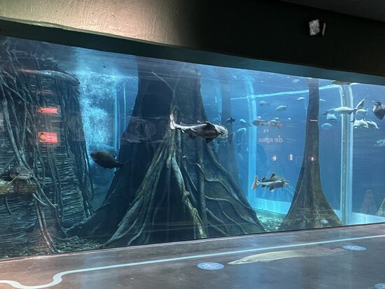 Als erstes gehe ich ins Aquarium und steige die Stufen hinunter, die in den Bauch des Museums führen. Und dann stehe ich vor den grössten Aquarien, die ich je gesehen habe. Hinter den dicken Glasscheiben wird ein Wassersystem im überschwemmten Dschungel dargestellt. Riesige Urwaldbäume stehen da im Wasser, so wie das am Ende der Regenzeit auch in Iquitos ist. Zwischen den ausladenden Wurzeln schwimmen Fische. Riesige Welse mit ihrem breiten Maul und dem Bart, grimmige Barben, grosse Piranjas. Alles ist da. Was vor allem spannend ist, ist wie sie schwimmen. Sie schwimmen nicht nur geradeaus, sondern steil nach unten, umrunden den Baum, die Wurzeln, machen schnelle Tiefgänge, rasante Schussfahrten. In kleinen Aquarien sieht man Fische eigentlich nur in der Wagrechten, was so ein Bild im Kopf entstehen lässt. Hier sind sie senkrecht, in Schräglage, schnell und stehend. Ich bin völlig fasziniert.
