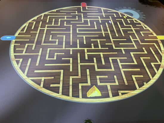 Es geht um das Gehirn und wie es arbeitet. Zuerst fällt mir das grosse Labyrith auf. Zwei Leute versuchen daran, ihre kleinen Mäuse zum Käse zu bringen. Ich übernehme die gelbe Maus die sich mit vier Knöpfen steuern lässt. Wäre eigentlich gar nicht so schwierig, wenn das ganze sich nicht dauernd drehen würde. Immer, wenn ich glaube, dass ich jetzt weiss, wie es nach rechts/links, oben oder unten gesteuert werden kann, dreht das Rad um eine Vierteldrehung und alles schaut wieder ganz anders aus. Spannend und sehr herausfordernd.