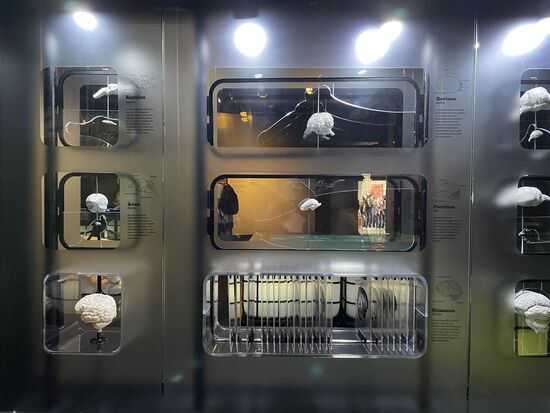 Im nächsten Schaukasten sind verschiedene Hirne ausgestellt und ihre Beziehung zur Grösse des Körpers. Ein Reptil, ein Vogel und der Mensch. Spannend, wie winzig die Hirne von Tieren sind und wie sie sich trotzdem auf besondere Eigenschaften spezialisiert haben. Es gibt Schaukästen, in denen gezeigt wird, wo die verschiedenen Zentren sind, die wir brauchen, zum Beispiel zum Sprechen, zum Sehen, zum Hören.