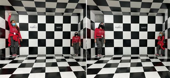 Immer wieder werde ich von einer der jungen Aufseherinnen angesprochen. Sie wollen mir die einzelnen Objekte erklären. Zum Beispiel die Kammer mit dem Schachbrettmuster. Zwei ungefähr gleich grosse junge Frauen stellen sich in je eine Ecke und wechseln dann den Platz. Ein verblüffender Effekt, den ich gar nicht so genau nacherzählen kann. Ich liebe optische Täuschungen.