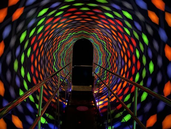 Ich gehe noch zum magischen Tunnel. Bevor ich auf den Steg trete kommt ein kleines Mädchen auf mich zu und empfiehlt mir, mich an der Seite festzuhalten. Sie hat recht, als ich hineingehe, fängt der ganze Tunnel an sich zu drehen. Zwar stehe ich auf dem Steg völlig ruhig, aber mir wird tatsächlich leicht schwindelig. Ein sehr spezielles Gefühl. Wenn das was man sieht nicht dem entspricht, wa man fühlt.