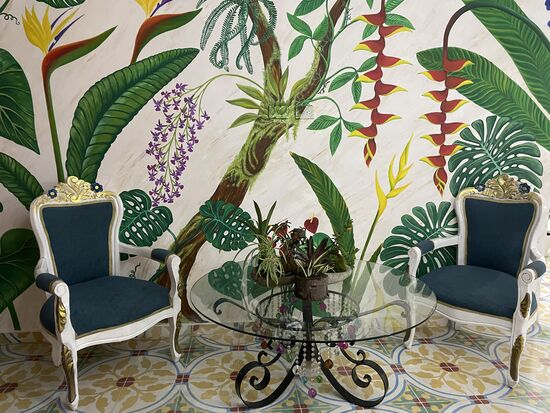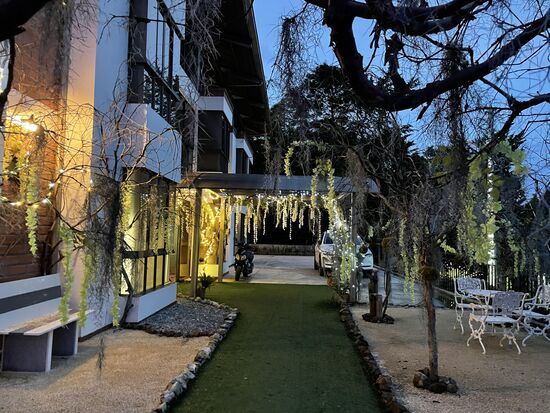 Im Garten sind ganz viele Girlanden aufgehängt, dazwischen leuchten blaue und weisse Lämpchen und alles ist sehr romantisch. Weisse Stühle, filigrane Tische oder majestätische Sessel im Entree. Dazu Wandmalereien mit Schmetterlingen und Blumen. Gäste scheint es kaum zu haben, aber vielleicht täuscht das, es ist später Nachmittag.