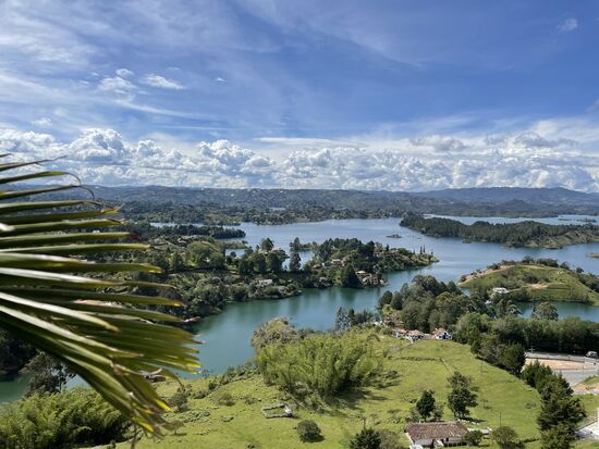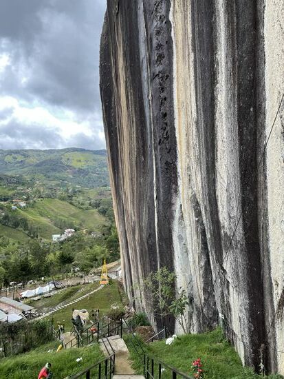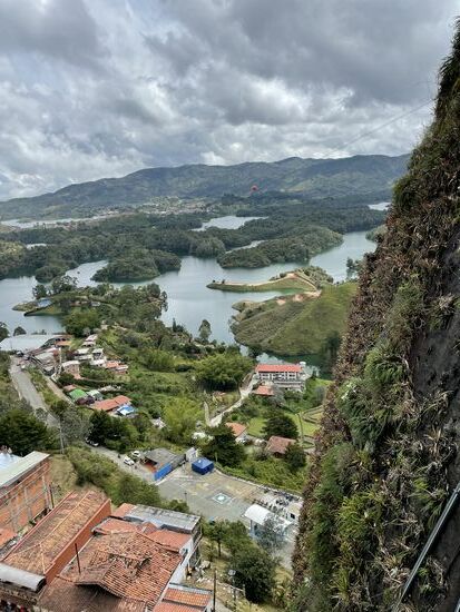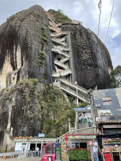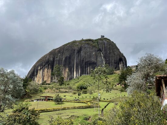 Beim Frühstück steht er über mir, El Penol, dieser Monolith, der einfach nur la Piedra, der Stein, oder the Rock genannt wird. Beim genauer Hinsehen, sehe ich plötzlich eine Gondel die langsam hinaufschwebt. Ich dachte das wäre ein Stromkabel, das hinauf führt, doch da hängt eine Gondel.