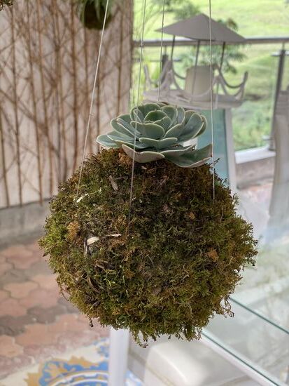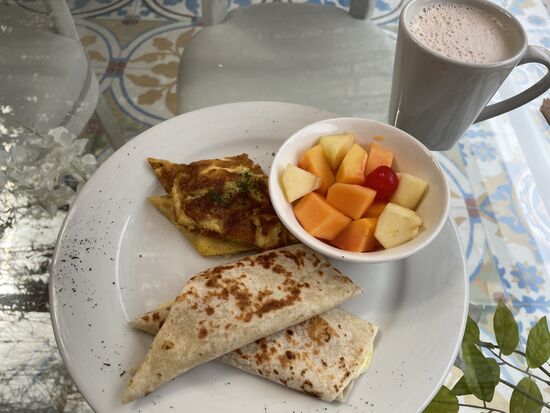 Jetzt kann ich mein Frühstück geniessen und mich auch noch ein wenig umsehen in dem offenen Restaurant. Von der Decke hängen Mooskugeln mit Pflanzen. Die Leuchter sind alle mit Glitzersteinen und künstlichen Blumen geschmückt. Das Hotel hat tatsächlich einen sehr eigenen Stil. Kitschig-romantisch. Aber nicht schwerer Kitsch, sondern alles in einer verspielten Leichtigkeit.