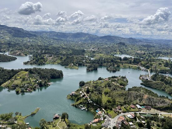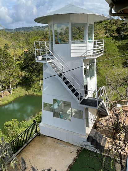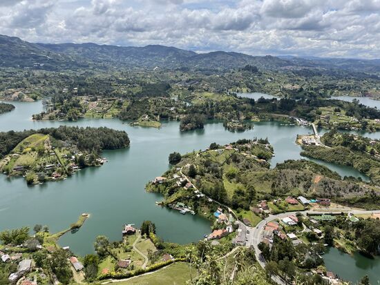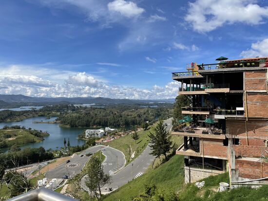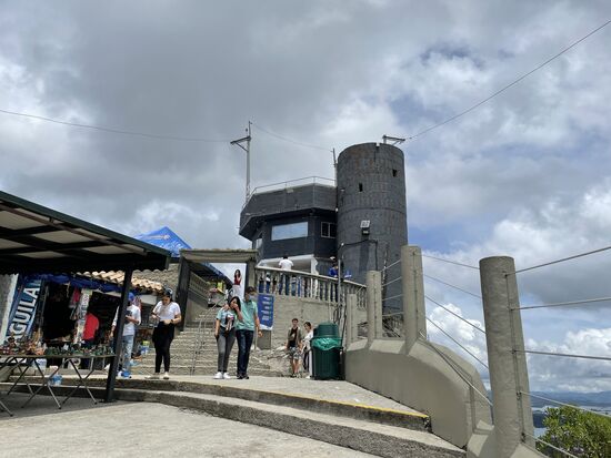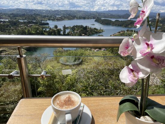 Ganz unten an der Treppe gibt es einige Restaurants mit Aussichtsterrassen. Die hatte ich vorher gar nicht beachtet. Man ist hier auf grosse Touristenmassen eingerichtet. Die Leute kommen Gruppenweise in Tagesausflügen von Medellin her und bestimmt ist der grosse Parkplatz normalerweise voll, die Restaurants ausgebucht, die Souvenirläden belagern. Jetzt ist alles friedlich. Ich bin der einzige Gast auf der Sonnenterrasse und geniesse meine Cappuccino.