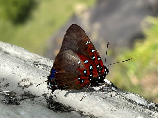 Nachdem ich mich erfrischt habe, gehe ich auf den Aussichtsturm. Dort ganz oben checke ich noch einmal meinen Höhenmesser: 2149 m. Also knapp 150 m Höhenunterschied vom Anfang der Treppe. Einzig die Höhe an sich macht da noch etwas zu schaffen. An der Mauer entdeckte ich einen wunderschönen Schmetterlnig. Auch er hat es bis hinauf geschafft. Mit seiner Leichtigkeit motiviert er mich. Man kann vieles erreichen, wenn man es ohne Verbissenheit angeht. Ich schaue ihm noch eine Weile zu, wie er da auf der Kante balanciert, bevor er seine Flügel öffnet und davonschwebt.