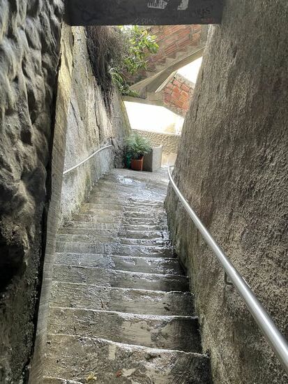 Und das mache ich. Ich fordere mich nicht bis zum letzten, warte nicht, bis mir das Herz aus dem Kopf springen muss, Bis mir der Kopf fast zerplatzt. Ich nehme mir Zeit. Auf den Stufen ist alle 25 Stufen eine Zahl angebracht. Das hilft mir enorm. Die ersten 100 Stufen geschafft, 200, 300. Etwas über der Hälfte steht eine Marienstatue an einem Abzweiger. Ich nehme sogar die paar zusätzlichen Stufen in Kauf, um sie aus der Nähe sehen zu können. Ich habe ja jetzt die Hälfte geschafft, da werde ich auch den Rest noch schaffen.