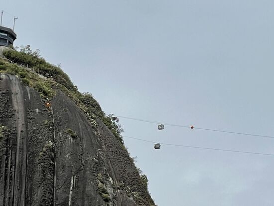 Ich schaue wieder hinauf, doch da ist nichts mehr zu sehen. Narrt mich jetzt mein Verstand? Ich google, finde nichts von einem Teleferico am Penol, und doch, da kommt schon wieder eine. Sogar zwei, eine steigt, eine fährt hinunter. Und dann lange nichts mehr.
