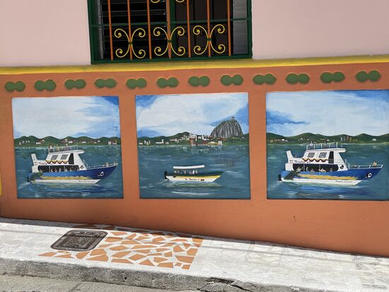 Ich laufe durch die Gassen, bleibe immer wieder stehen und bewundere die Vielfalt der Muster. Ganz allmählich steige ich dabei hinauf und bald habe ich die letzten Häuser hinter mir gelassen und komme zum Aussichtspunkt über dem Dorf. Hier wo die Marienstatue steht, hat man einen wunderbaren Blick zum Penol und über das Dorf hinweg bis hinunter zum Hafen am See. Dorthin will ich später auch noch, doch vorläufig gehe ich zurück zum Hauptplatz.