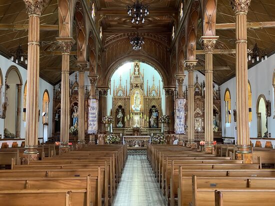 Frisch gestärkt verlasse ich das Restaurant und trete in die Kirche. Sie ist mit ihren schlanken Säulen und der Holzdecke sehr schön und strahlt Wärme aus.