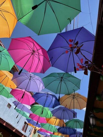 Meim Weitergehen komme ich in eine Strasse mit Regenschirmen. Wunderschöne, farblich abgestimmte Schirme hängen über der Strasse und laden zum Fotoshooting ein. Immer wieder werden hier Selfies oder eigentliche Fotosessions gemacht. Zum Teil mit dem Handy, zum Teil aber auch mit professionellerer Ausrüstung. Ich schaue eine Weile zu und muss dann natürlich auch ein paar Selfies machen. Immerhin habe ich hier genügend Schirme, um alle zukünftigen Standortwechsel einzuleiten.