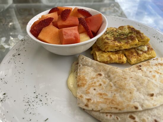 Dann kommt das Frühstück mit Omelette und Tortilla mit Schinken und Käse. Dazu eine Schale Früchte. Ob es da Fleisch drin habe, will der junge Mann wissen und holt wieder seine Software zu Hilfe. No carne, no no, meint das junge Màdchen, nachdem sie ihn eindlich verstanden hat. Schon will er beruhigt anfangen zu essen, fragt aber doch noch einmal nach, was das in der Tortilla denn sei. Die Software kommt an ihre Grenzen, denn er macht ziemlich komplizierte Sätze und die junge Frau weiss überhaupt nicht, was sie damit machen soll. Noch einmal mische ich mich ein. Jamon, Schinken IST Fleisch. Aha, jetzt hat es auch das Mädchen verstanden, sie nimmt den Teller zurück, bringt neue Tortillas ohne Schinken.