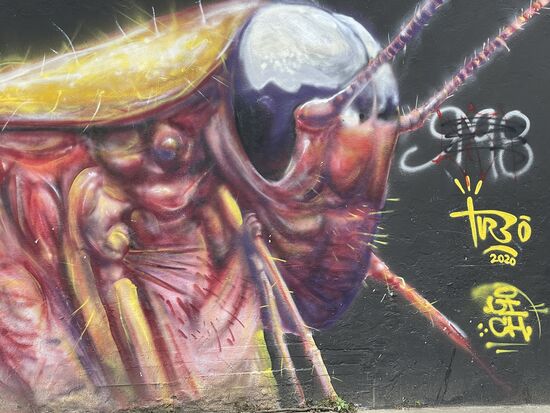 Ich bin hier an einer grossen Strassenkreuzung mit mehreren verschiedenen Fahrbahnen und Strassen in alle Richtungen. Dabei verlaufe ich mich ein paarmal, komme an riesigen Graffitis vorbei und bin plötzlich gar nicht mehr sicher, ob mein Navi mich überhaupt in die richtige Richtung weist. Darum halte ich nach einer kurzen Rast auf einer Bank ein Taxi an. Dieses bringt mich innert kürzester Zeit zu meinem Ziel. Da das Schloss am Hang steht, bin ich doppelt froh, dass ich nun nicht zu Fuss hinauf steigen muss.