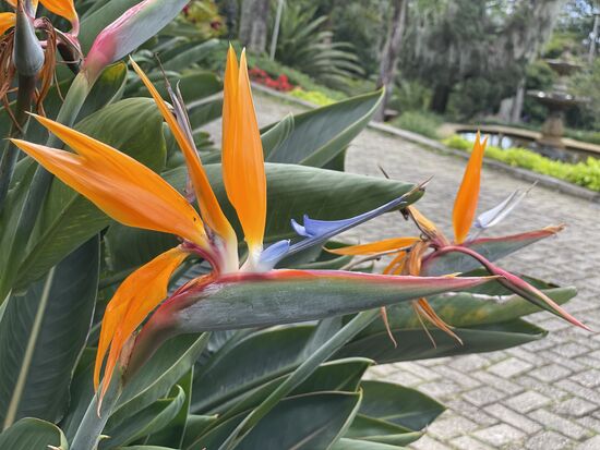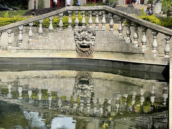 Nach der Führung durch das Schloss mit seinen vornehmen Räumen und den verschiedenen Terrassen, die immer wieder neue Ausblicke hinunter auf die Stadt erlauben, schlendere ich noch eine Weile durch den Garten. Es ist ein sehr gepflege Anlage mit Rabatten aus schön geschnittenen Buchsbäumen, Strelizienfeldern, in denen Gärtner dabei sind, verblühte Blumen und Blätter zu entfernen. Ein italienischer Garten, in dem statt Rosen exotische Strelizien und Heliconien blühen. Dazu gibt es verwunschene kleine Pfade unter hohen Bäumen mit den verschiedensten Heliconien. Hohe Palmen unterbrechen die Aussicht, in den beiden Brunnen gibt es Wasserspiele, die allerdings im Moment nicht in Funktion sind.