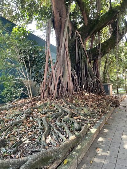 Dabei begegne ich diesem riesigen Gummibaum, der seine Luftwurzeln der Erde entgegen streckt, wo sich bereits ein riesiges Wurzelwerk ausbreitet und bereits anfängt die Pflastersteine aufzubrechen. Was so ein gewöhnlicher Gummibaum für Energien entwickeln kann, wenn man ihn in seiner Entwicklung nicht einschränkt, ist schon sehr enorm.